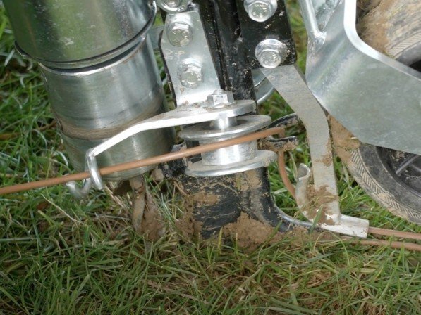 De wielen zijn verstelbaar om de afstand van de draad tot de rand in te stellen. Het gepatenteerde systeem maakt het mogelijk een dubbele draad te leggen bij het vormen van eilanden. De 180° roterende kop wordt vastgezet bij rechte stukken. Geschikt voor de perimeter kabel van alle robotmerken.