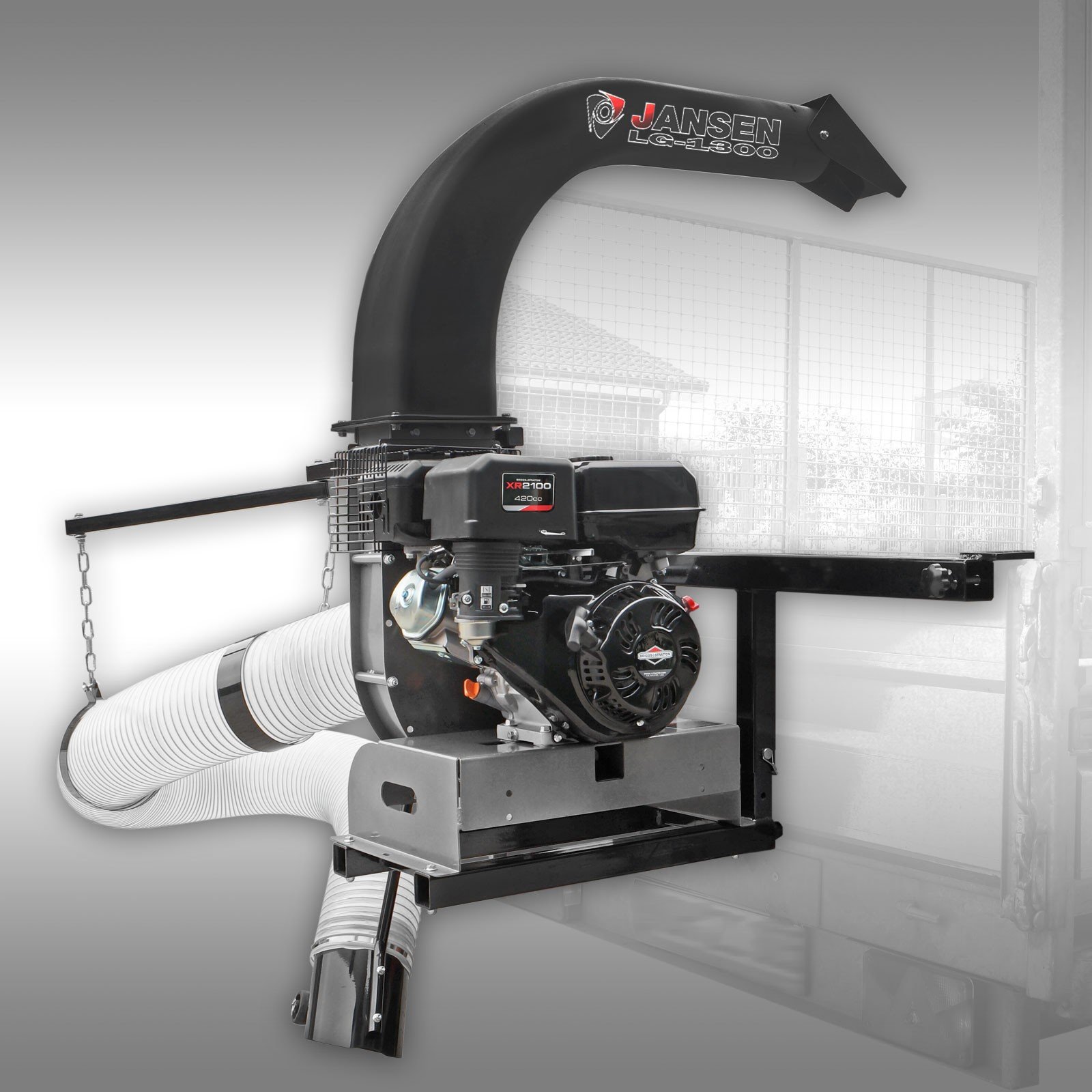 De Jansen LG-1300 truckloader bladruimer is een krachtige zuig-unit inclusief aanbouwframe, geschikt voor montage op vrijwel alle voertuigen met laadbak en zijschotten. Hiermee zuigt u in een handomdraai bladeren, gras, papier en meer op, en voert het via de uitblaaspijp direct af naar de aanhanger. De uitblaaspijp kan 90 graden draaien middels vier schroeven en beschikt over een uitblaasklep om de luchtstroom en blaasrichting te bepalen. Met de optioneel beschikbare uitwerpverlenging zijn zelfs hogere aanhangers geen probleem.