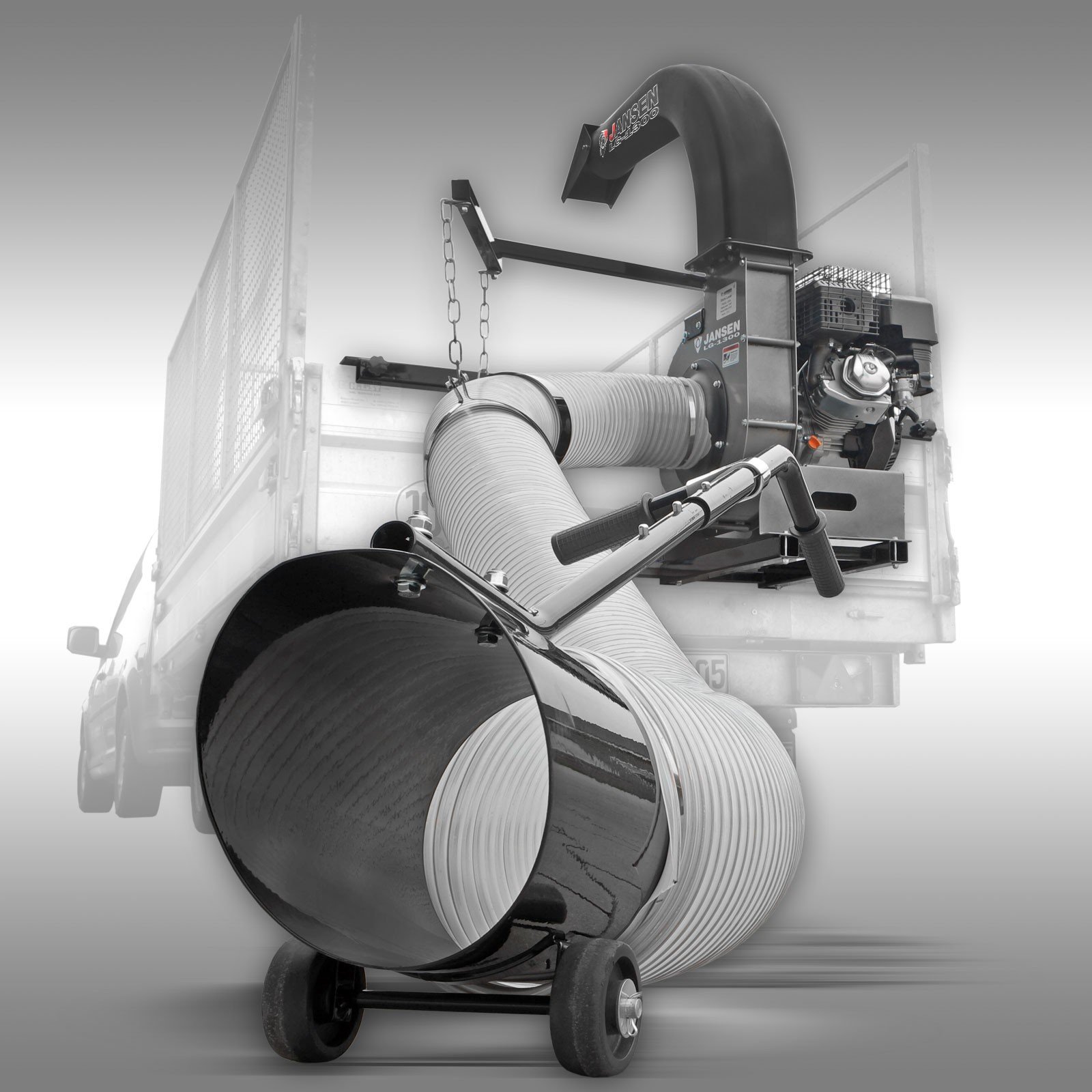 De Jansen LG-1300 wordt geleverd met een 3 meter lange zuigslang (20 cm doorsnee), inclusief stevige steunen met loopwielen en handgreep. De zuigslang is universeel verstelbaar en wordt ondersteund door een ophangsysteem, wat de bediening aanzienlijk vergemakkelijkt.