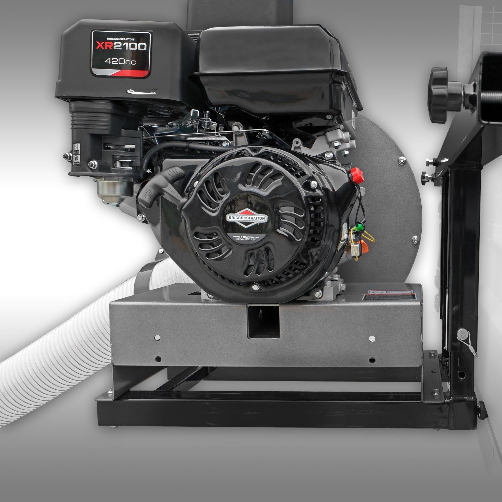 De betrouwbare en sterke 13 PK benzinemotor van Briggs & Stratton drijft de krachtige turbine aan, die zich in een stevige behuizing bevindt. Het turbinewiel heeft een diameter van 400 mm en is uitgerust met 4 grote en 4 kleine schoepen die ervoor zorgen dat het aangezogen materiaal tot een minimum wordt verkleind en gecomprimeerd. Het apparaat heeft een zuigcapaciteit van circa 3800 m³/h.