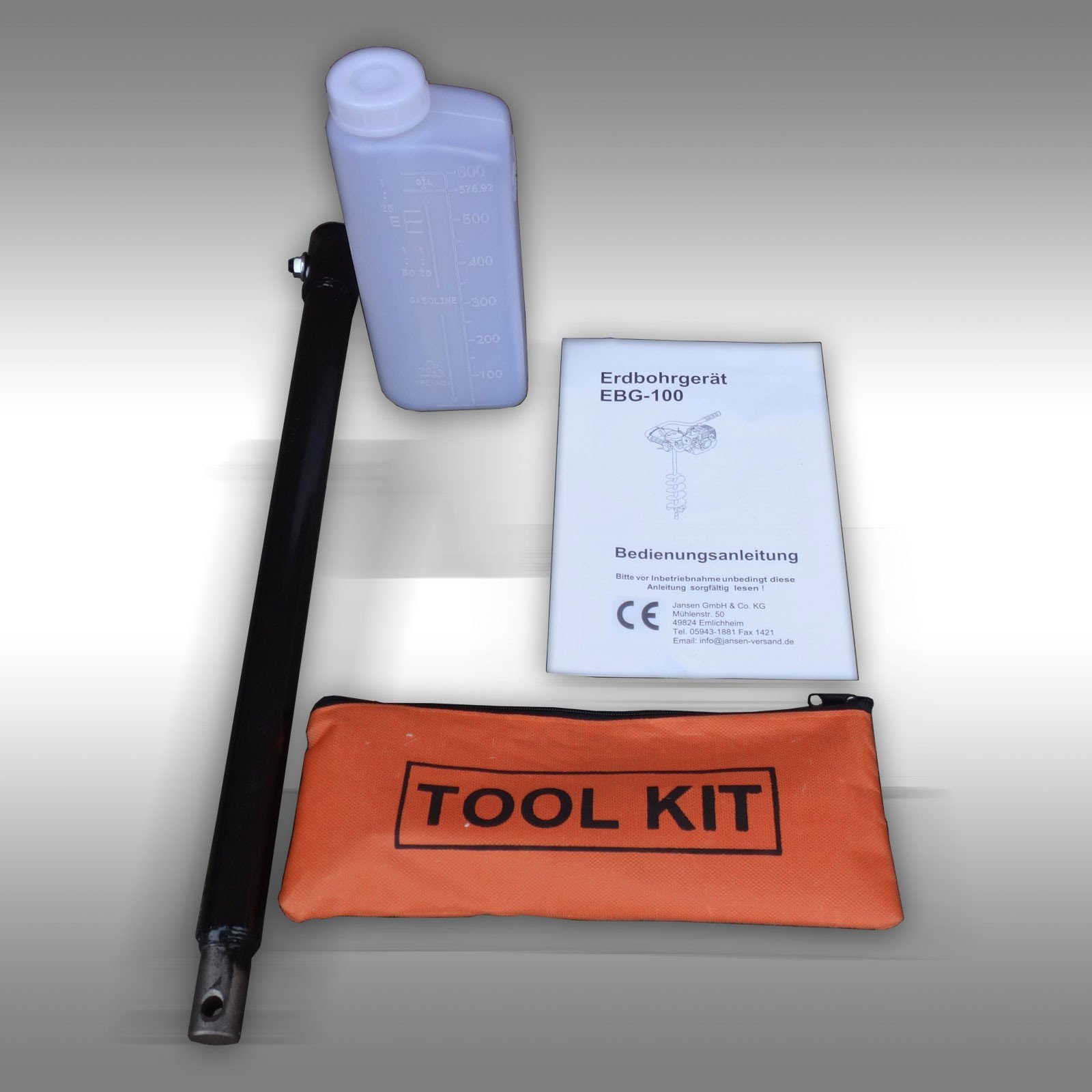 De Jansen EBG-100 wordt geleverd met een 100 mm en een 200 mm boor, beide met een lengte van 1000 mm. Een 400 mm boorverlengstuk is ook inbegrepen om de boordiepte te vergroten.