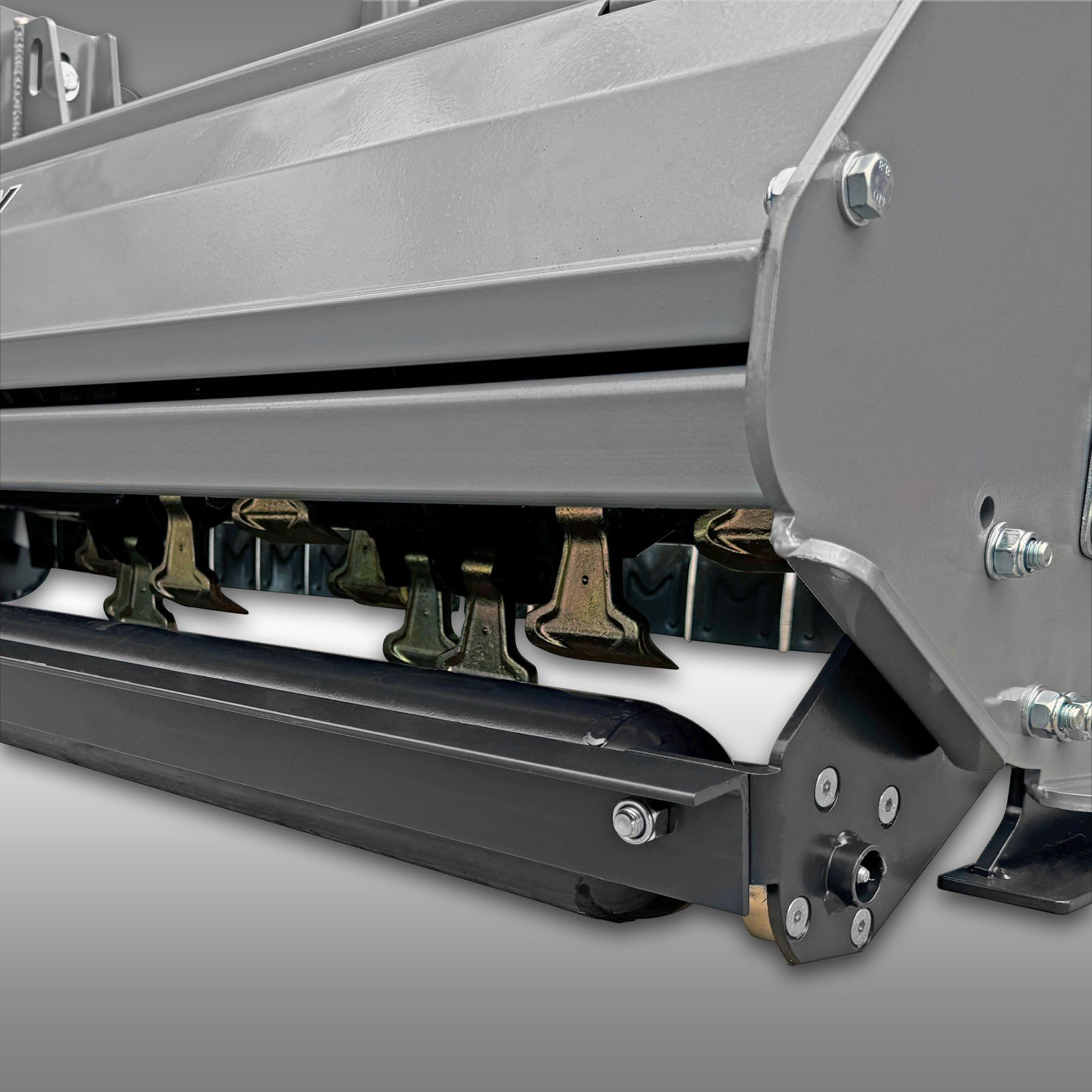 Deze klepelmaaier is uitgerust met een zware transmissie en 28 geharde hamermessen, waardoor hij geschikt is voor het verwerken van hoog gras, bos- of stroachtig materiaal. De dubbele spiraalrotor zorgt voor een rustige loop en lange levensduur. De maaihoogte is instelbaar via de zijdelings gemonteerde glijstang.