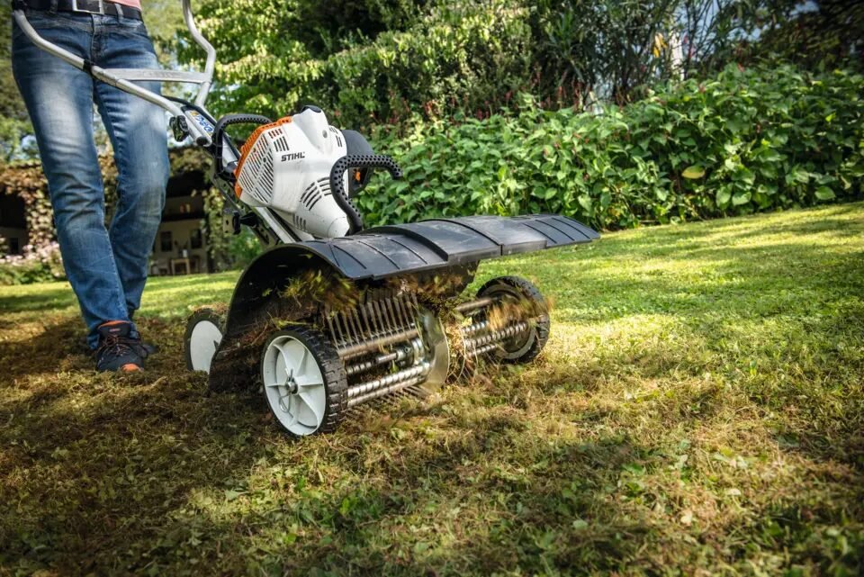 De STIHL Moshark MF-MM is speciaal ontworpen voor het verwijderen van mos en vervilte lagen uit uw gazon. Dit zorgt voor een betere beluchting van de bodem en bevordert de groei van gezond gras.