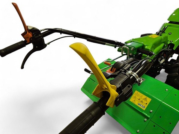 De machine is voorzien van een automatische ontkoppeling van de frees bij achteruit rijden, een dubbele koppelingshendel met vasthoudfunctie, en een trekhaak voor veelzijdig gebruik.